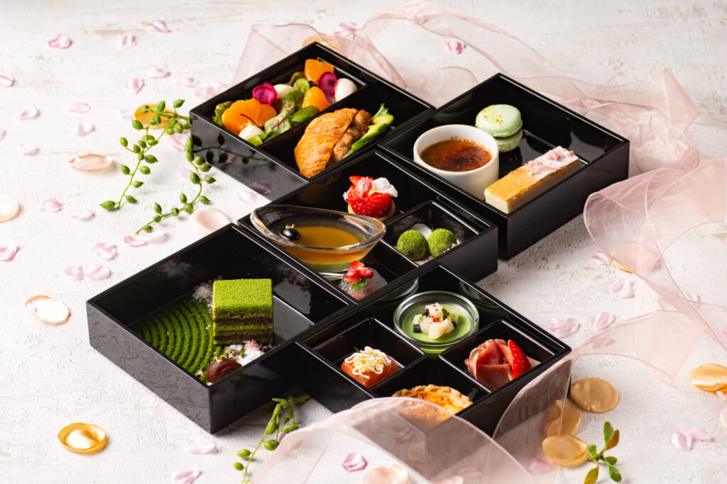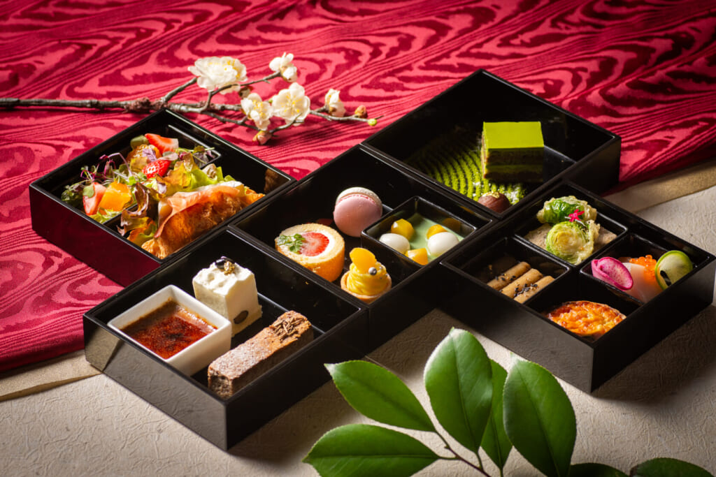 八坂の塔をイメージした五段のお重に、季節のスイーツやセイボリーを彩った”京KASANE”。